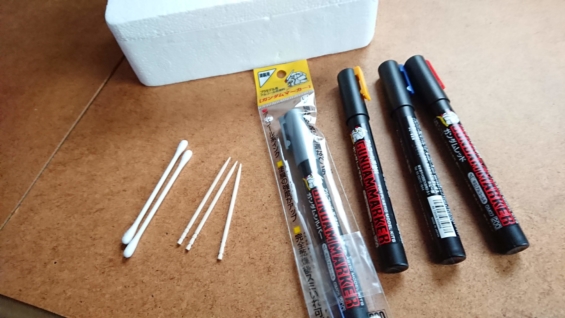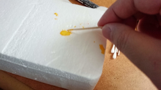 ティッシュだとガンダムマーカー吸い込んじゃって、全然つまようじにつかないので発泡スチロールに垂らしました