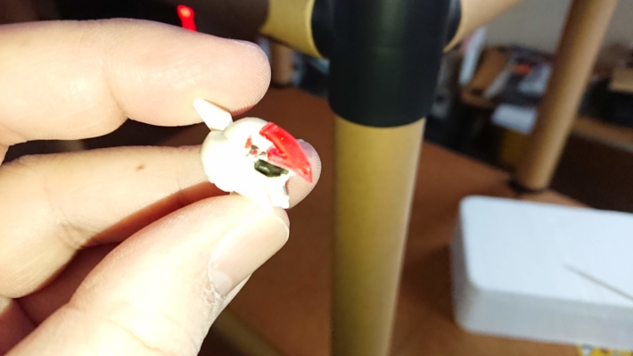 正面からみると、右目の所の黒い中にある白い点のところが今回塗るべき『目』です