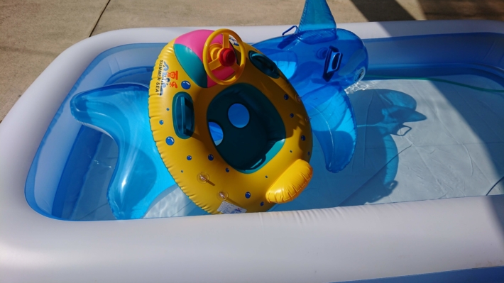 4人もプールに入っていればけっこう大きいプールでもギュウギュウです。ましてやシャチ(青)もいるんで、大人の入る隙間はありません。
