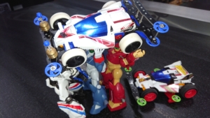 思い入れのあるおもちゃを集めます。ロボット3つに車2台。