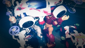 思い入れのあるおもちゃを集めます。ロボット3つに車2台。