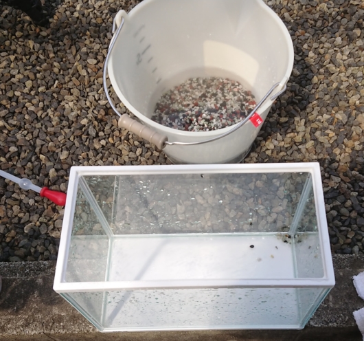 外に行き、金魚水槽をザバザバと洗います。砂利とかもずいぶん汚れがたまってました。