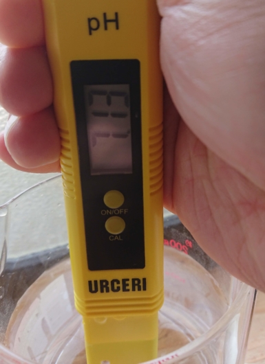 水道水ですすいで、計量カップに水道水を注いで、inして数値が安定するまで待ちます。