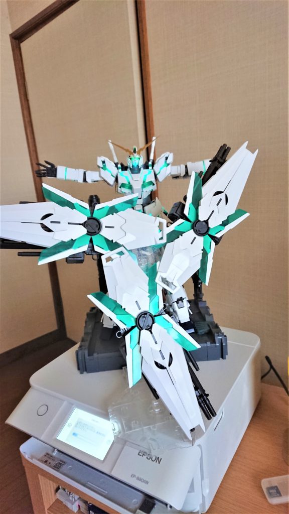 あとはなんとなく『RGフルアーマーユニコーンガンダム』を見上げるような位置に置いて、お気に入り度がガタ落ちした『ニューガンダムHWS』をガンプラ繋がりで同じラインに。