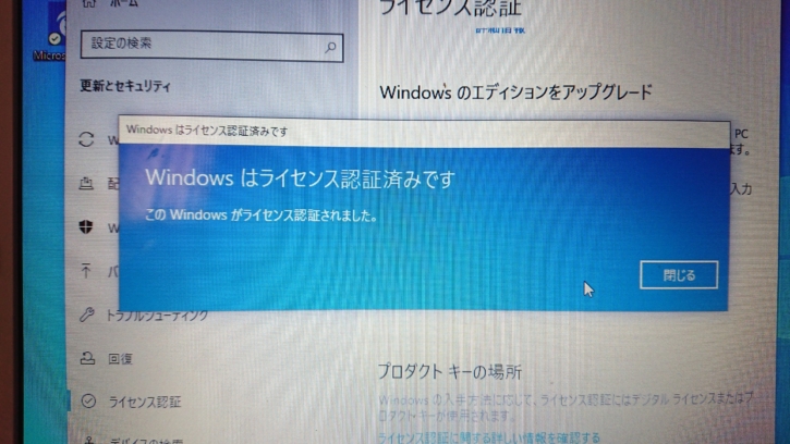 インストールが終わりライセンス認証を見てみましたが、認証されていなかったのでPCの裏に貼ってあった『Microsoft』のシールのプロダクトキーを打ち込んでみました。