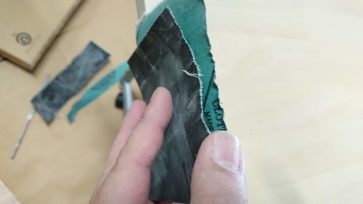 このままではいろいろ手に刺さりそうなので、紙やすりで全体をこすります。