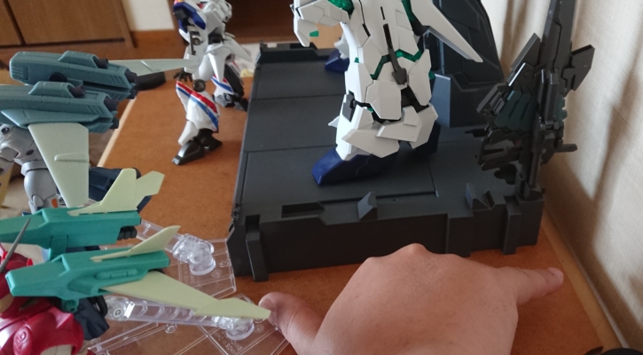 あとはなんとなく『RGフルアーマーユニコーンガンダム』を見上げるような位置に置いて、お気に入り度がガタ落ちした『ニューガンダムHWS』をガンプラ繋がりで同じラインに。
