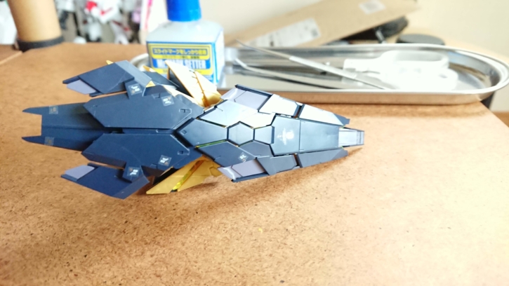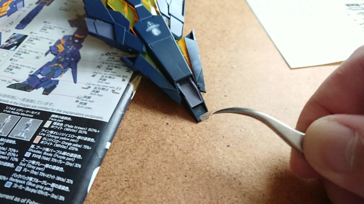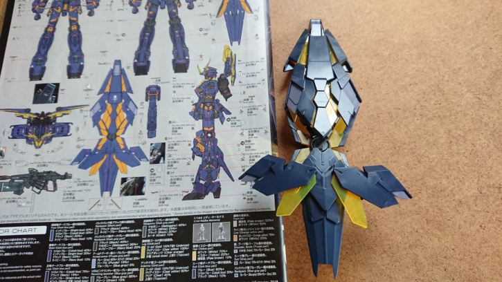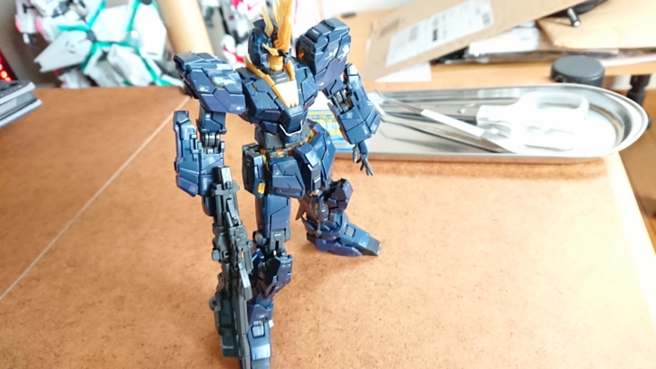 デストロイモードだったのでユニコーンモードに変形させてからの作業です。それだけで30分はかかったと思います。とくに肩の変形つらいよ。