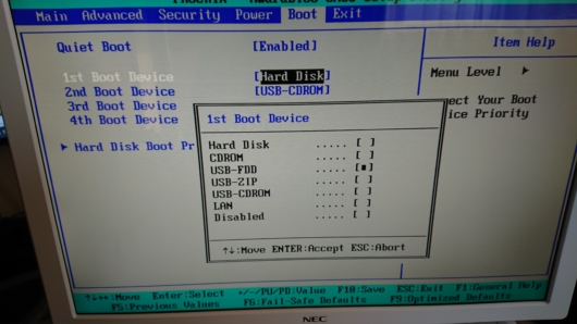 biosを設定して、USBから起動するようにします。NECならF2かエンターキーみたいです。