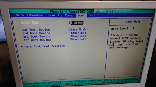 BIOS設定でHDDだけの起動にしました。もちろん意地でもHDDで起動するぞって意思表示です。