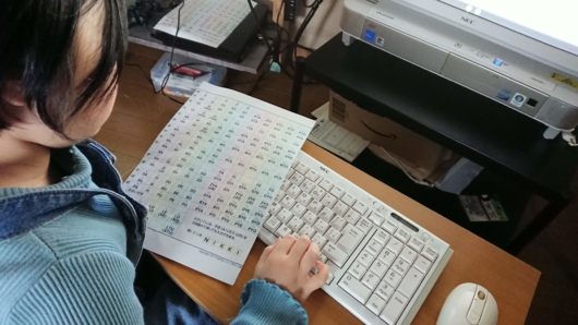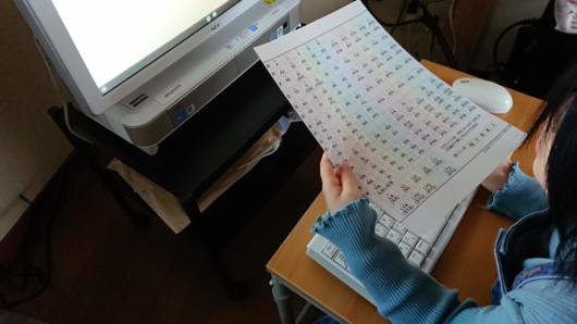 『キーボードローマ字表』見ながら楽しそうに日記をつけています。