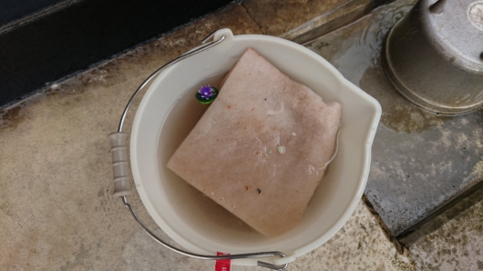 砂利、底面フィルター、真ん中に敷くやつをバケツに放り込んでジャバジャバ洗います。