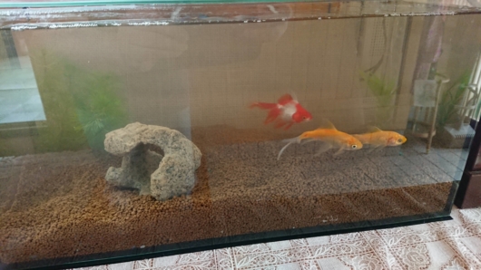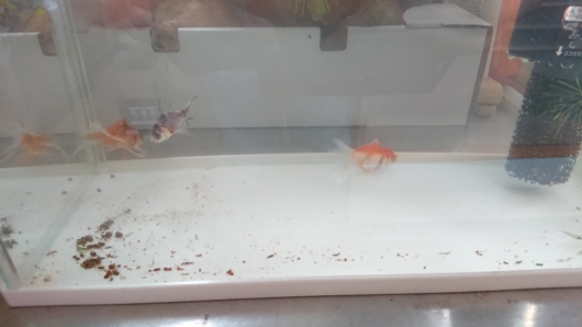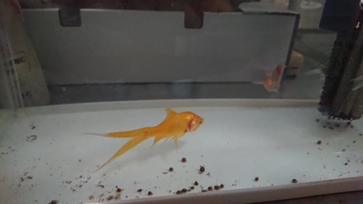 メイン水槽の大きい方のゴールデンコメットは、1日で赤い内出血のような症状は消えました。