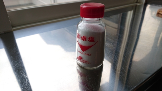 困ったことに、ウチの塩はこんな入れ物に入っているので、天然なのか博多なのかわからない塩ですが、しょっぱいので確実に塩です。間違いありません。