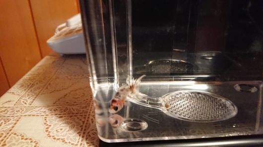 水面付近にいたのでエサと勘違いしたのかもしれませんが、イジメかもしれないと、ほっとけなくなったので、ミニ水槽に隔離する準備を始めました。