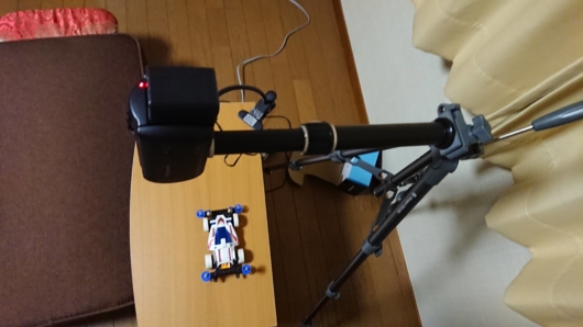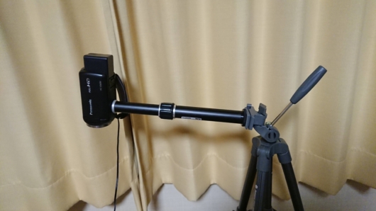 壁に三脚の足を当て、机でバランスをとるスタイルです。