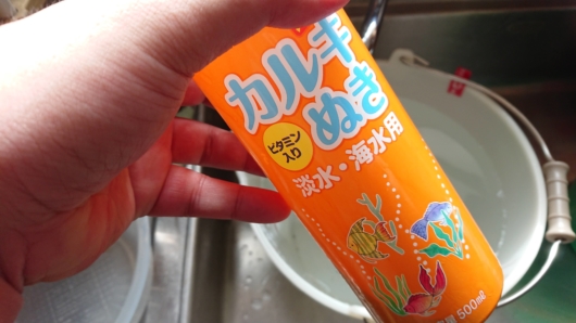 その後、バケツにたっぷりの水をいれカルキ抜き剤をいれます。