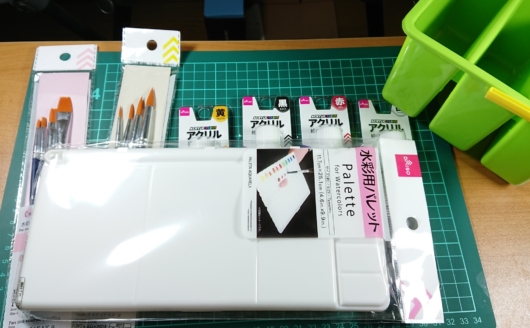 さっそく百均で絵の具などの色塗りに必要なものを買ってきました。