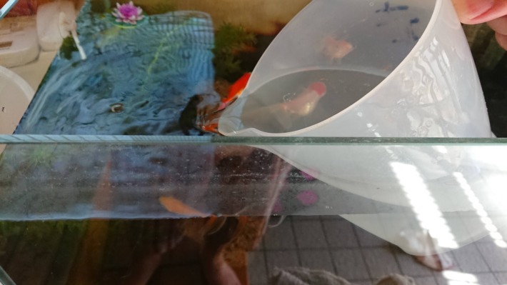 これは暑くて大変という合図だと思い、うだるような暑さの中、急遽水替えをすることにしました。