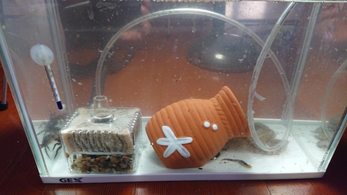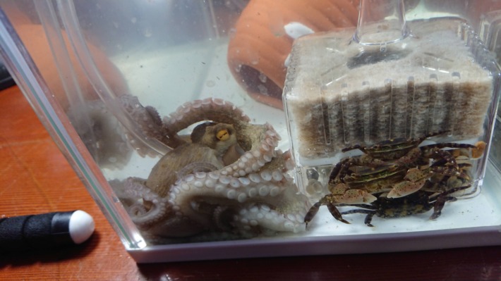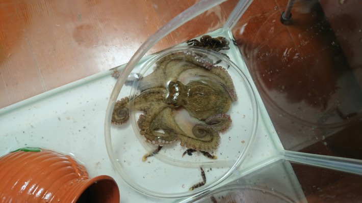 おかげで私のアドバイスを素直にうけいれてくれるようになり、タコは一匹だけとし、エサは慣れるまで生餌のカニという方向でいくことにしました。