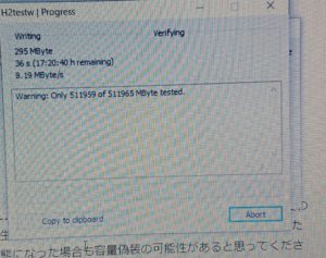 このソフト、SDカードに1Gずつ書き込んで、読み取れるかチェックするソフトらしいです。何ギガまで読めるかを調べます。